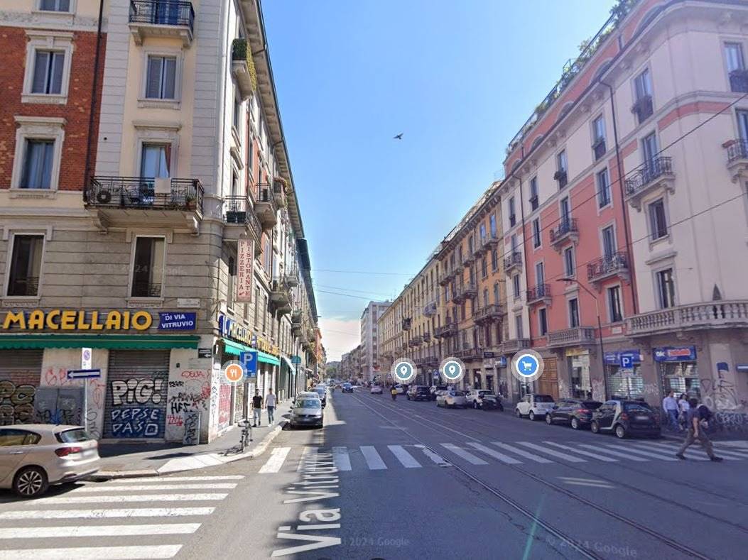 PORTA VENEZIA - LIMA: Nello stabile condominiale sito in via Vitruvio n. 8, con ingresso da via Tadino, ampio negozio all'asta (attualmente adibito a ristorante), costituito da un ampio locale, retro, cucina e servizi igienici al piano terreno, oltre ad ampio vano cantina/deposito, con locali di servizio e locali igienici, al piano interrato e collegati mediante scala interna. L'edificazione dello stabile risale al 1904 e la relativa abitabilità rilasciata nel 1906.